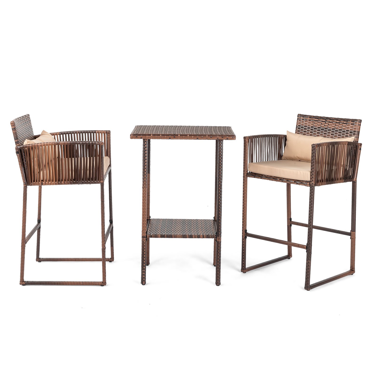 This set includes two wicker bar stools with high-density cushions and a bar-height table with a lower shelf. Perfect for patios, decks, or balconies, featuring brown gradient rattan and beige cushions for a timeless look.