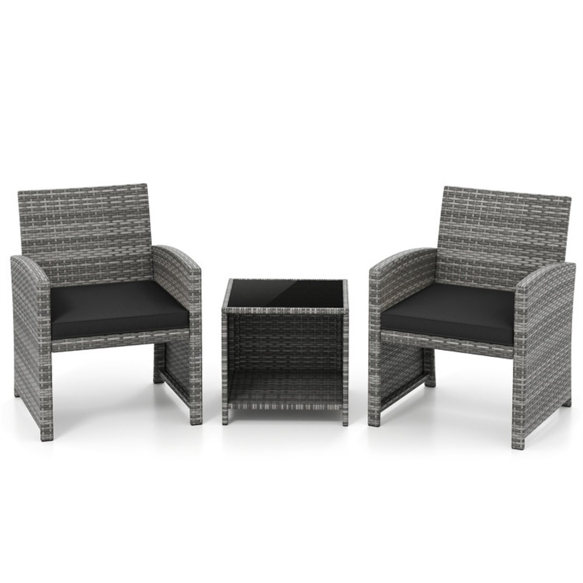 Mix Gray PE Rattan 2 Chairs with Black Cushions + 2-Tier Tempered Glass Side Table for Small Patios