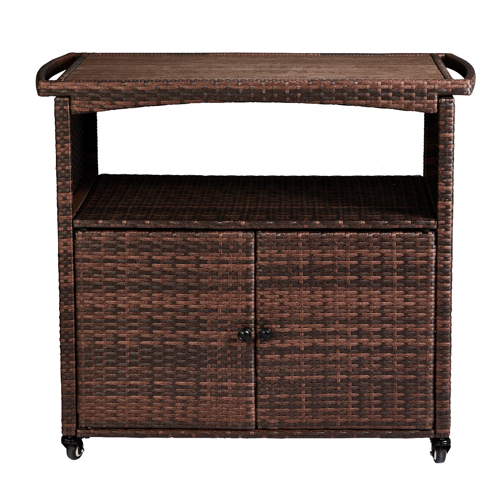 Outdoor Wicker Bar Cart with Storage Cabinet and Wheels, Brown Rattan Patio Buffet Table